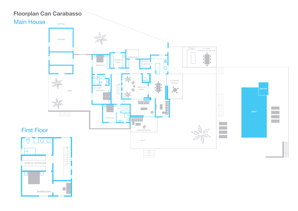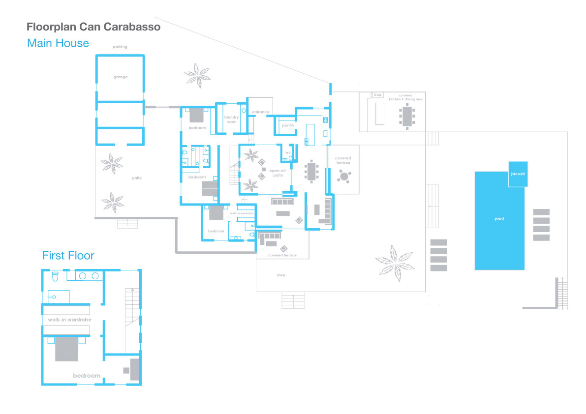 Can Carabasso ist eine fantastische Familienvilla mit großen Schlafzimmern, einem großen Außenbereich, einem großen Pool und entspannenden schattigen Terrassen, auf denen Sie einen Großteil Ihrer Zeit verbringen werden. Alle Wohnbereiche befinden sich in der unteren Etage und sind sehr gut mit den Außenbereichen und dem Poolbereich verbunden. Im Erdgeschoss befinden sich drei sehr komfortable Doppelschlafzimmer mit eigenem Bad, von denen eines als Doppel- oder Zweibettzimmer genutzt werden kann. Das stilvolle Hauptschlafzimmer mit eigenem Bad befindet sich im ersten Stock und ist über eine interne Treppe zu erreichen.