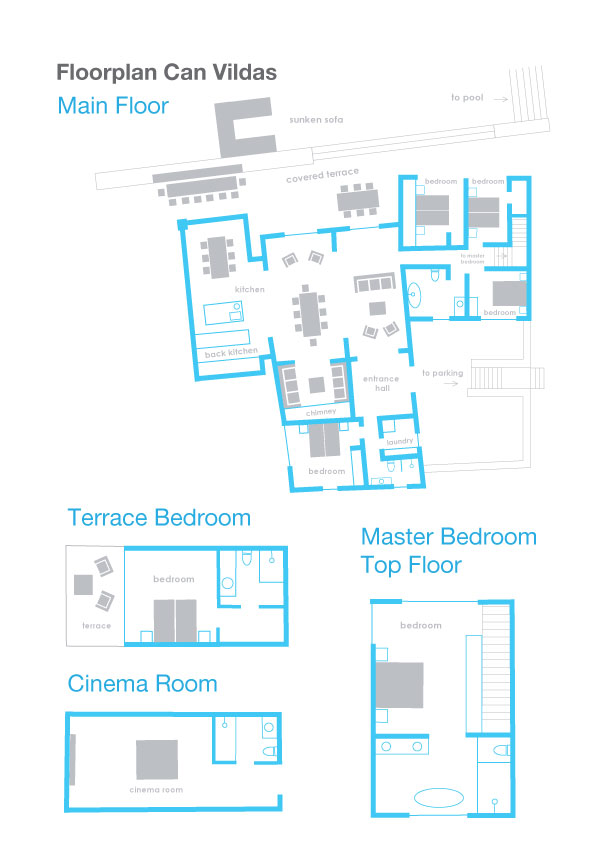Hay una espaciosa cocina abierta, área de comedor y de estar que se comunican directamente con la terraza comedor orientada al oeste, con su magnífica vista del atardecer. En la casa principal hay cinco habitaciones. La habitación principal ocupa todo el primer piso con un amplio baño en suite con bañera de pie. Abajo hay una habitación matrimonial con un baño adyacente, además de tres adorables habitaciones estilo bijou o para niños, todas las cuales comparten un amplio baño con bañera. Hay una habitación matrimonial anexa con baño en suite y terraza privada.