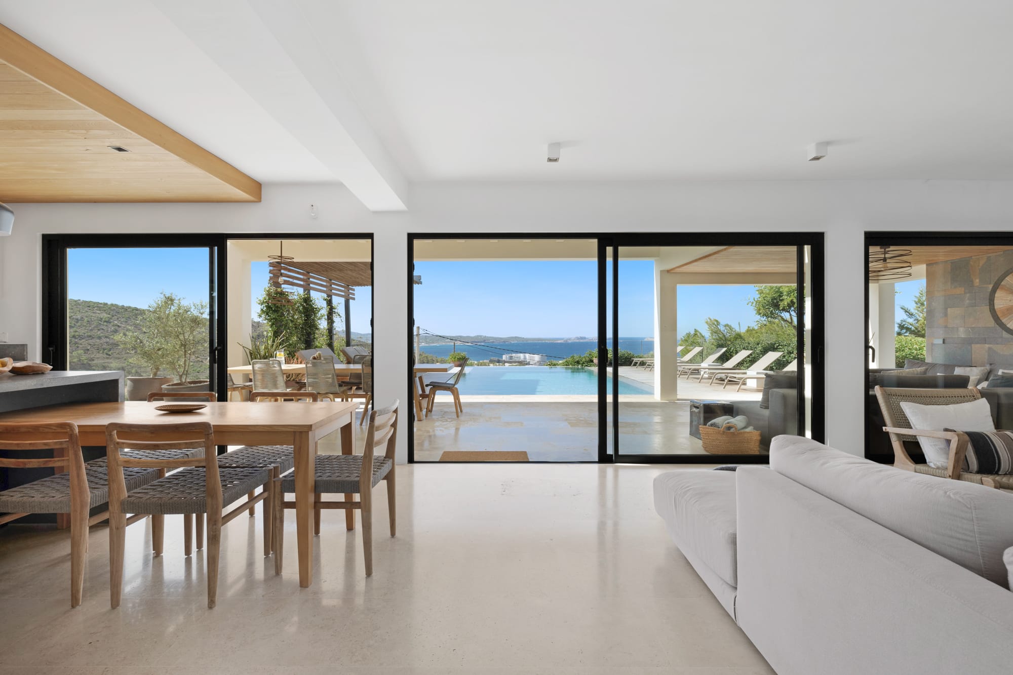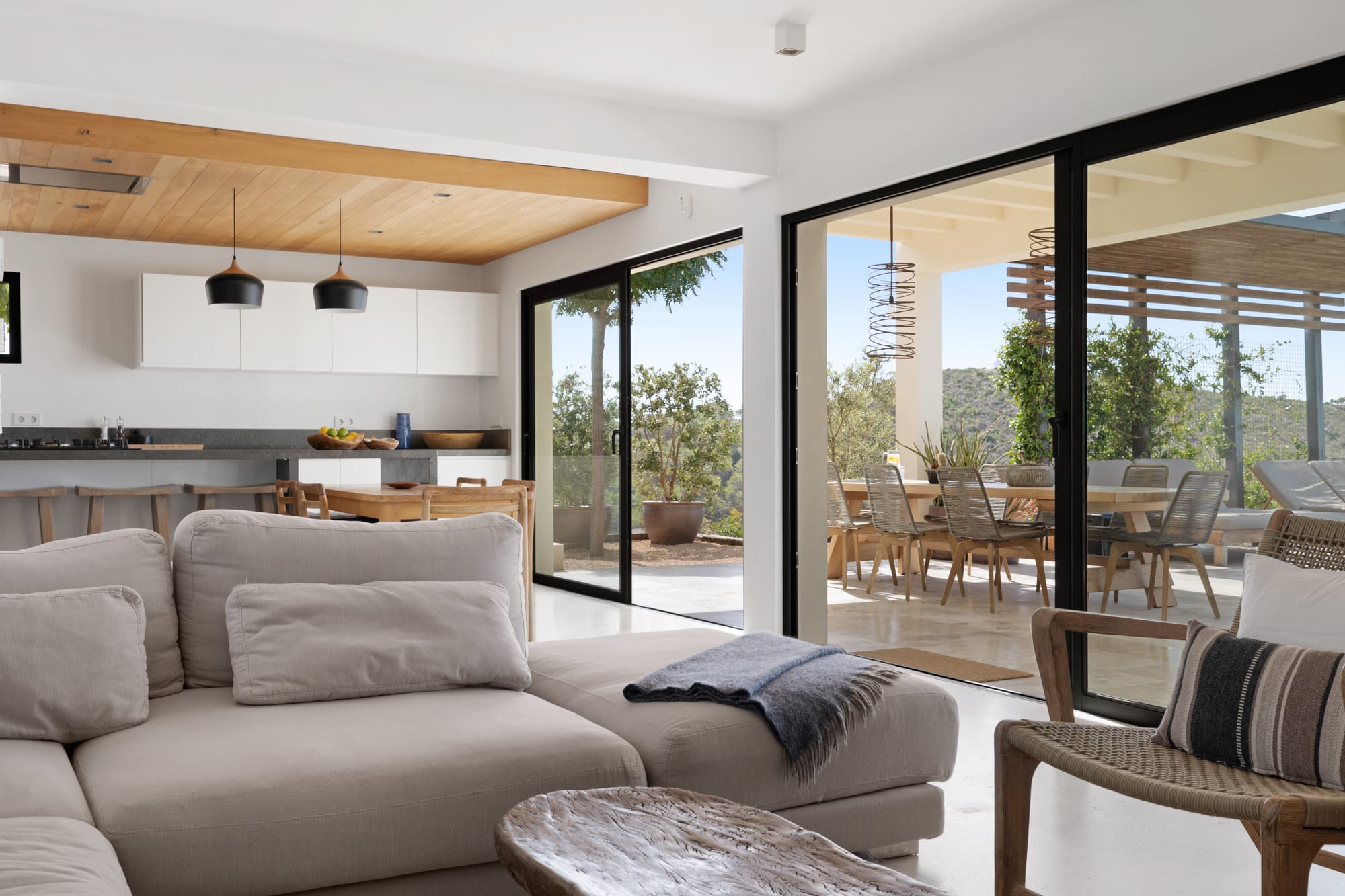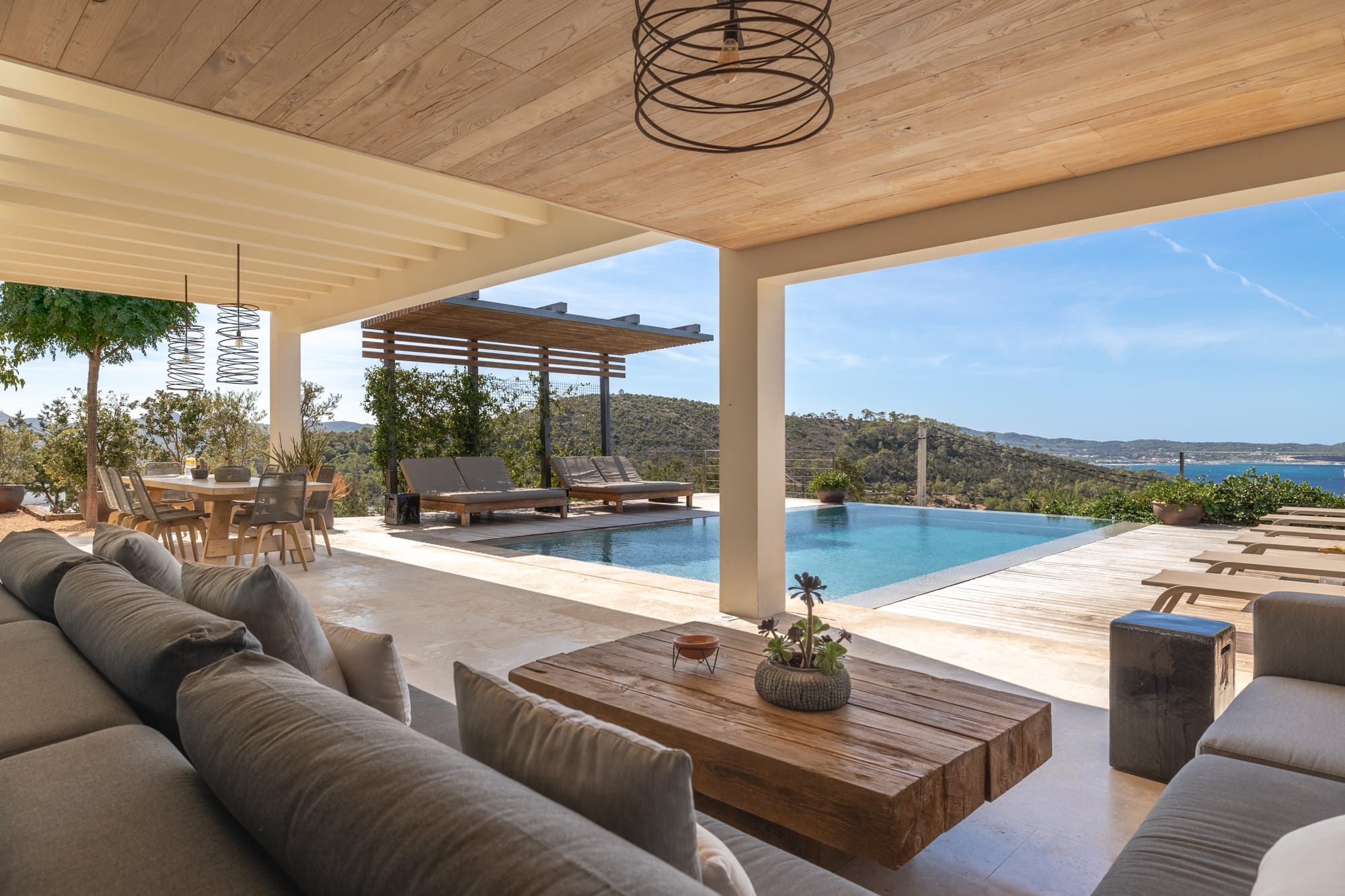 The distribution works equally well for two families or a group of friends. There are four bedrooms and four bathrooms split between an upper and lower floor of sleeping accommodation. The kitchen and living area are on the main ground floor and connect seamlessly with the covered outside dining and lounge space and the wooden decked pool terrace. The kitchen is a foodies paradise with a great island layout and the spacious outside dining table only a few steps away. To top it off there are lots of places to lie back and relax and find a bit of privacy, including the sofa beds on the easily accessible and child friendly roof area where those amazing views get even better.