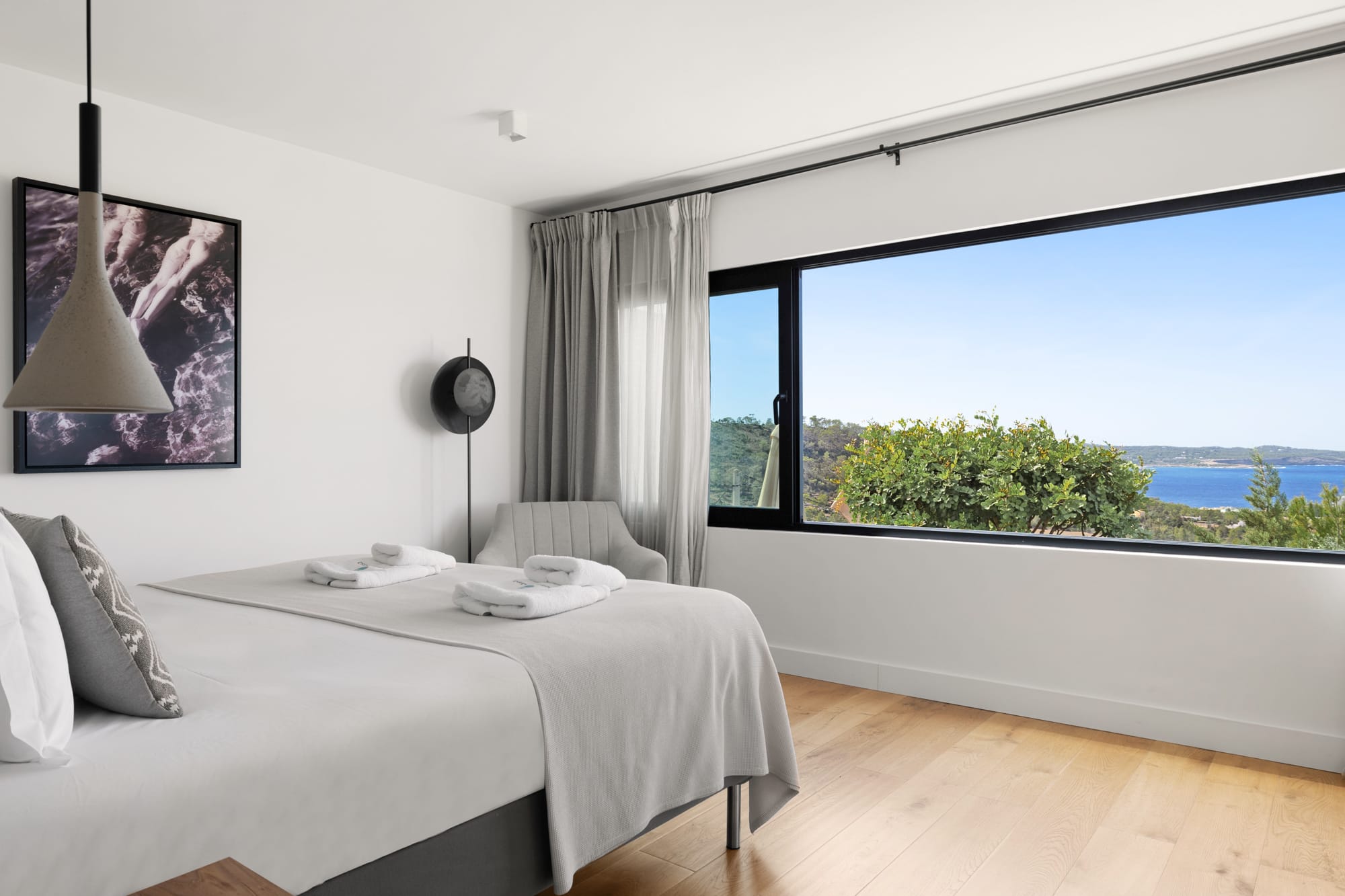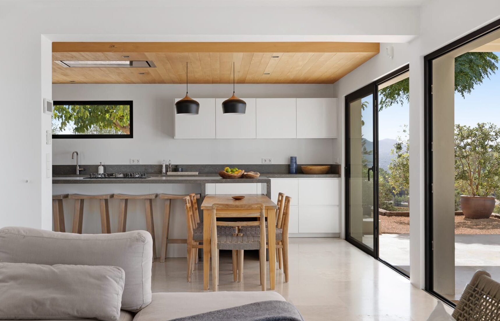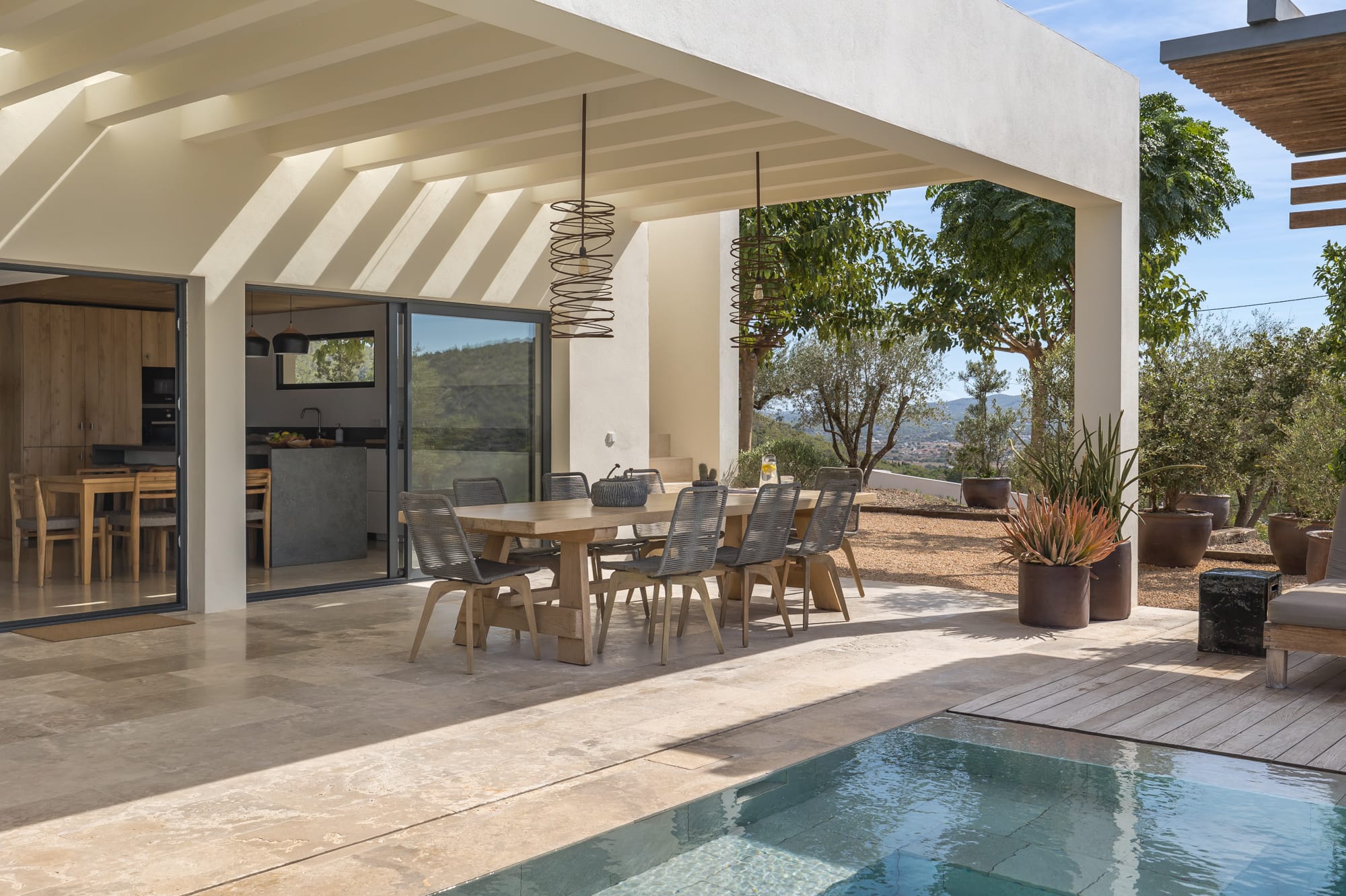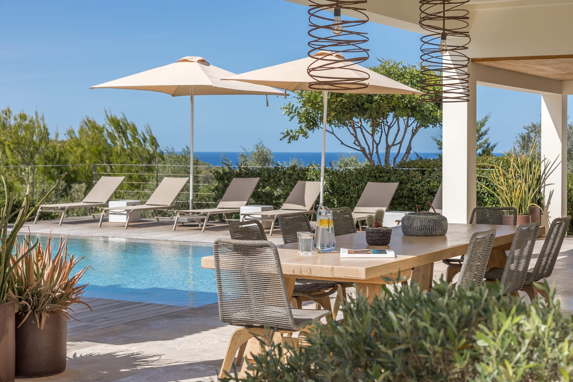 The distribution works equally well for two families or a group of friends. There are four bedrooms and four bathrooms split between an upper and lower floor of sleeping accommodation. The kitchen and living area are on the main ground floor and connect seamlessly with the covered outside dining and lounge space and the wooden decked pool terrace. The kitchen is a foodies paradise with a great island layout and the spacious outside dining table only a few steps away. To top it off there are lots of places to lie back and relax and find a bit of privacy, including the sofa beds on the easily accessible and child friendly roof area where those amazing views get even better.