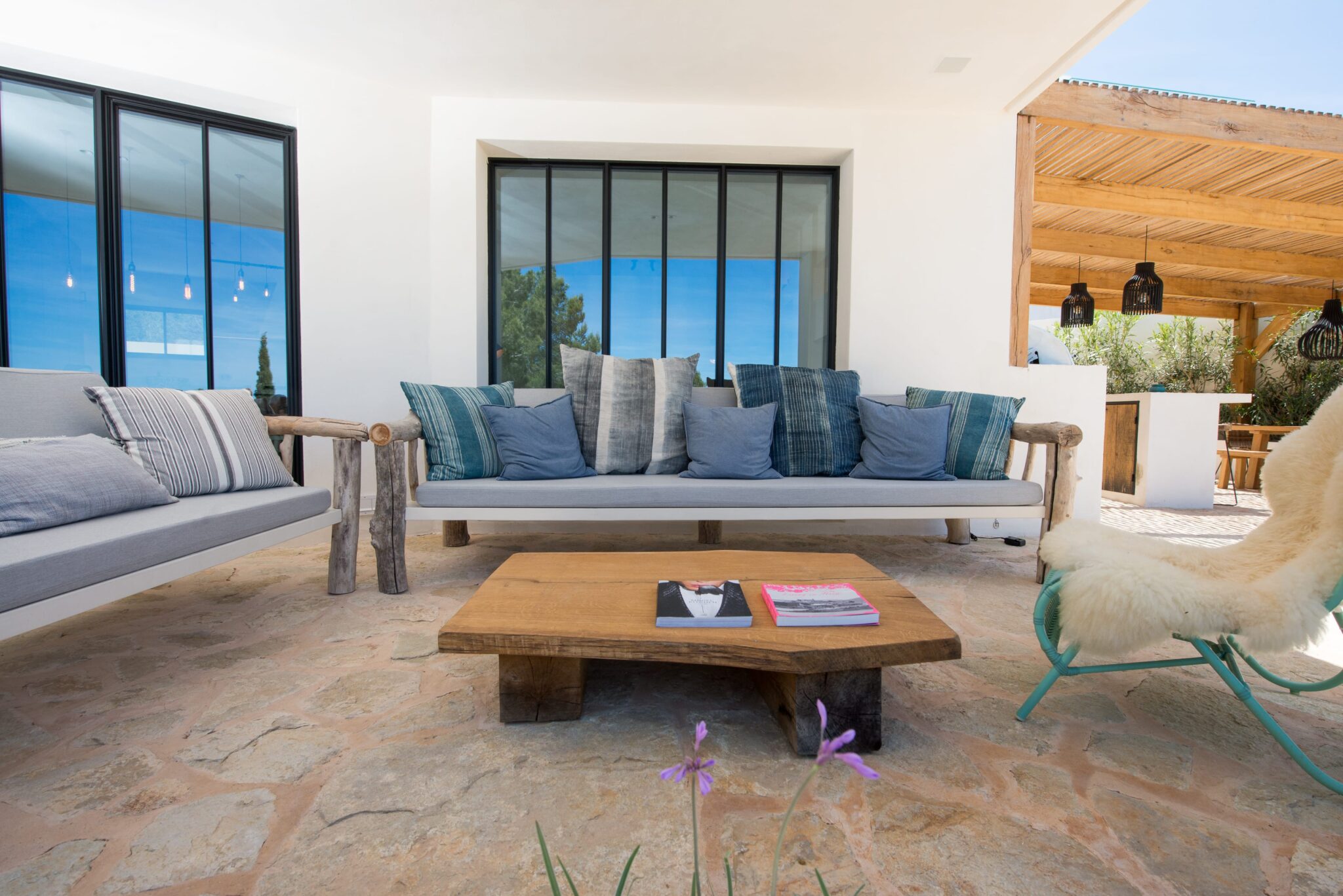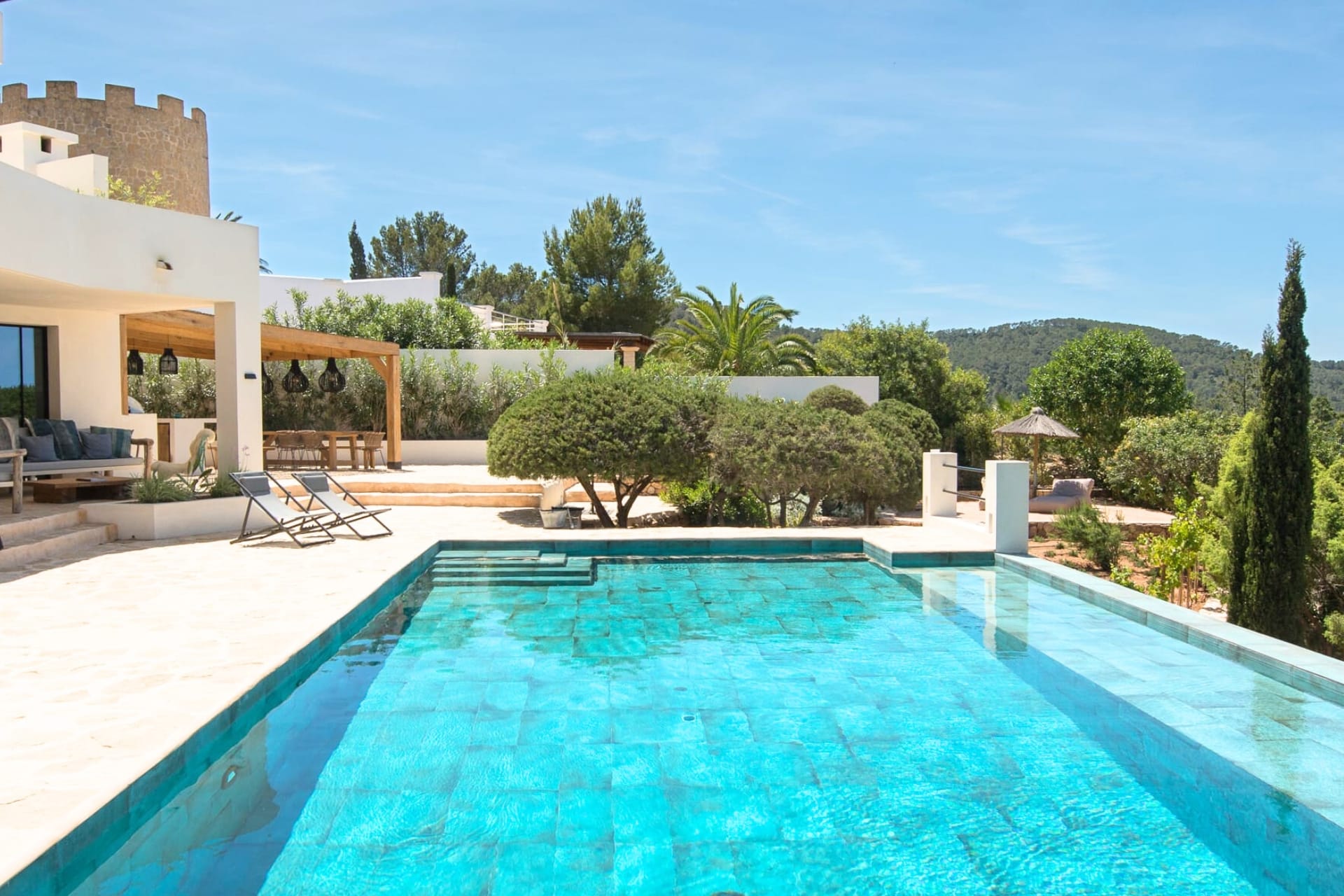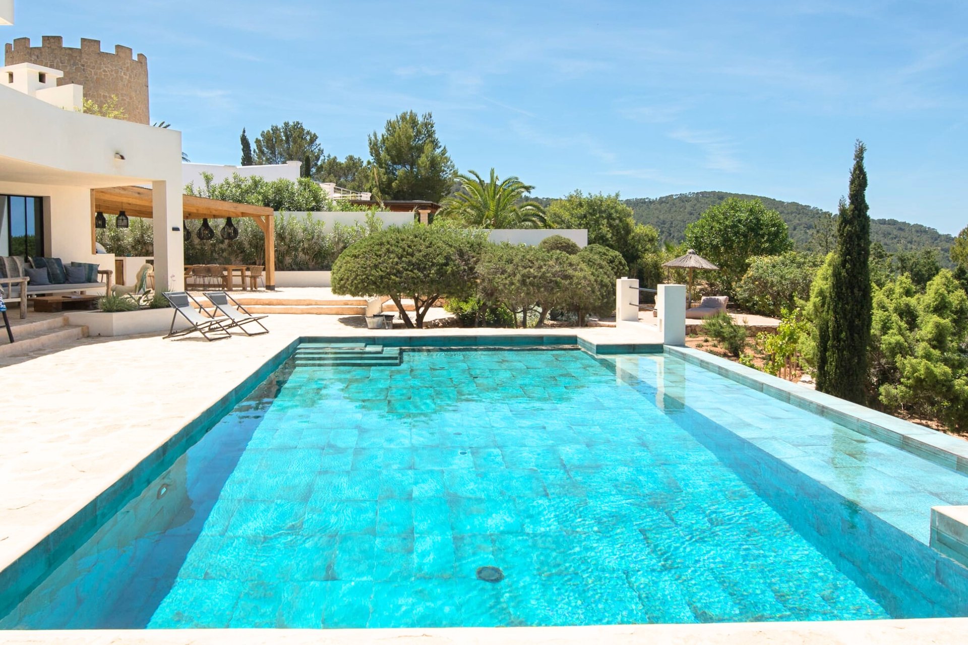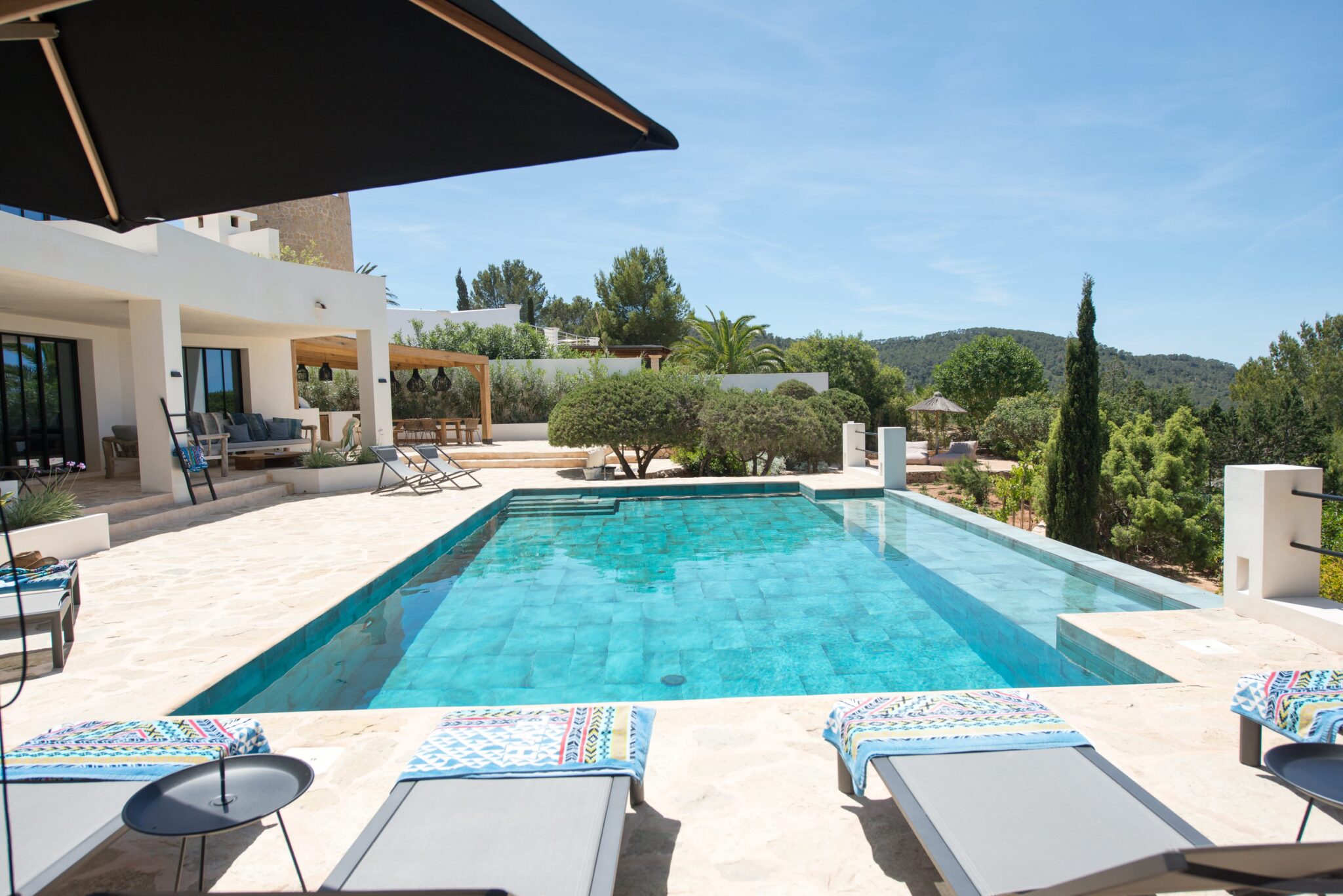 Perched on a tranquil hillside above Ibiza’s coveted west coast, this exceptional villa offers a refined escape where contemporary design meets island charm. Recently renovated and finished to the highest standards, the property accommodates up to 8 guests in absolute comfort.  The villa also offers many family-friendly features: a dedicated children’s playground, trampoline and slides to ensure younger guests are entertained, and even a boules (petanca) pitch for relaxed afternoons filled with family fun. The expansive heated pool terrace frames uninterrupted views of the Mediterranean, while the outdoor lounge and dining area provide a front-row seat to Ibiza’s legendary sunsets.